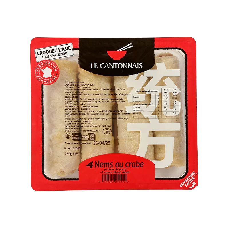 Viande de porc (31,9%), galette de riz (riz, eau, tapioca, sel), oignons, carottes, vermicelle de pois, chair de CRABE (3,6%), ŒUFS, sucre, sel, poivre