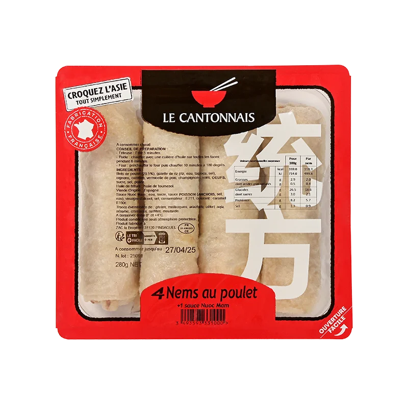 Sauce Nuoc Mam: Eau, sucre, sauce POISSON (ANCHOIS, sel, eau), vinaigre d’alcool, sel, conservateur: E211, colorant: caramel E150c.