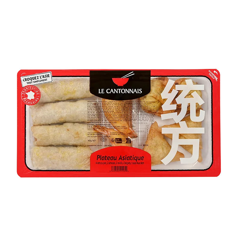 Raviolis chinois : Viande de porc (40,8%), farine de BLE (farine de BLE tendre, GLUTEN de BLE, fève, farine de BLE malté, acide ascorbique : E300, complexe enzymatique), oignons, ŒUFS, pousse de bambou, champignons noirs et parfumés, vermicelle de pois, sauce arôme HUITRE (eau, sucre, sel, essence de saveur d’HUITRE, exhausteur de goût : E621, amidon modifié, farine de BLE, extrait de levure, colorant : E150c, arôme), sel, sucre, huile de SESAME, eau, huile de tournesol, poivre, curcuma