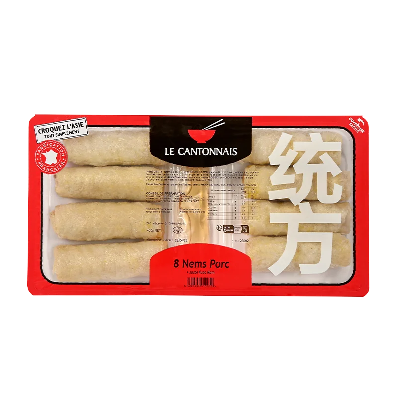 Nems au porc : Viande de porc (33,58%), galette de riz (riz, eau, tapioca, sel), oignons, carottes, vermicelle de pois, ŒUFS, sucre, sel, poivre
