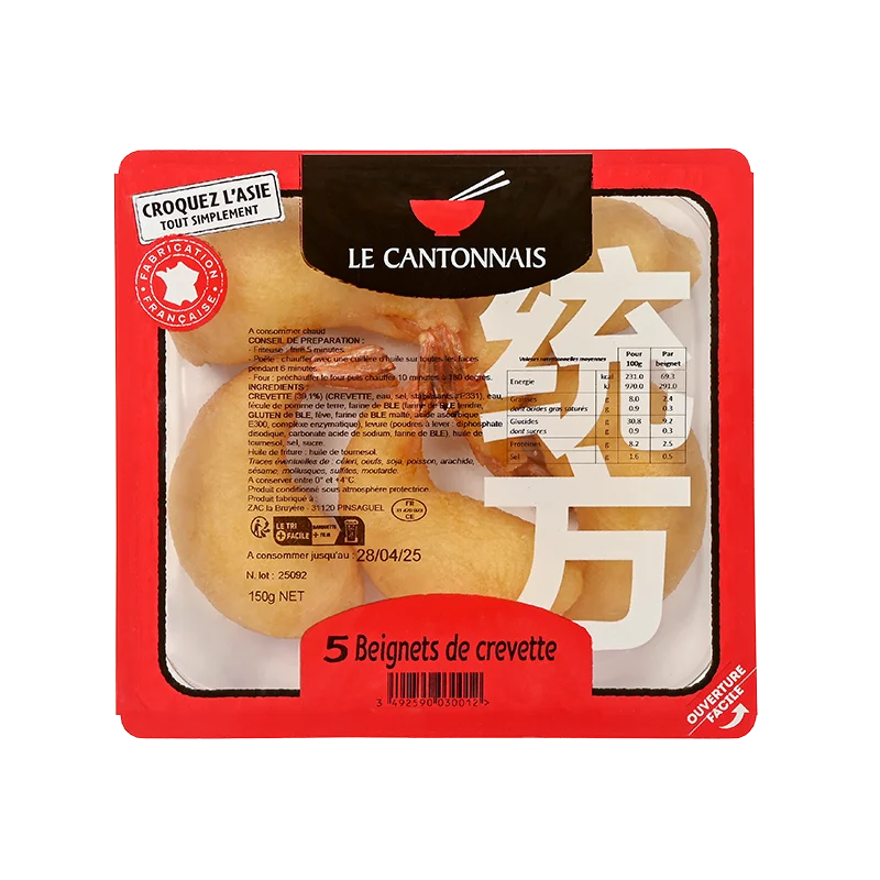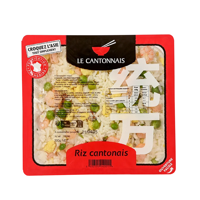 Eau, riz thaï (31,%), CREVETTES (CREVETTES, sel, régulateur d’acidité : E331 )(8,55%), ŒUFS, petits pois, oignons, huile de tournesol, sel, arôme naturel, ail, poivre,
